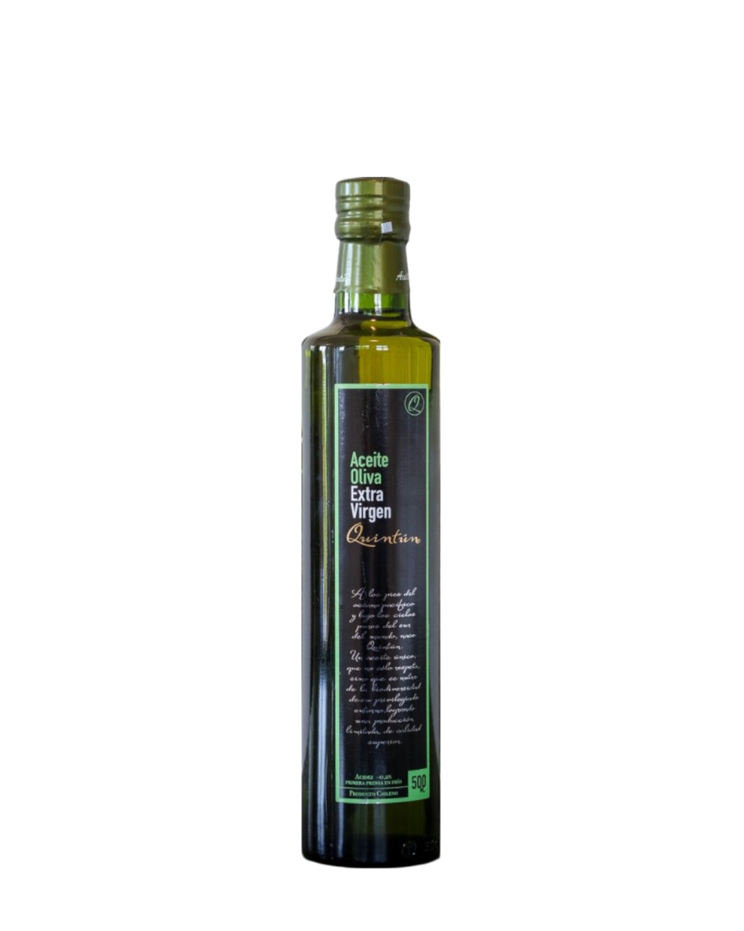 Botella de 500ml de aceite de Oliva Extra Virgen Quintún, elaborado y embotellado en origen en su planta de Algarrobo.